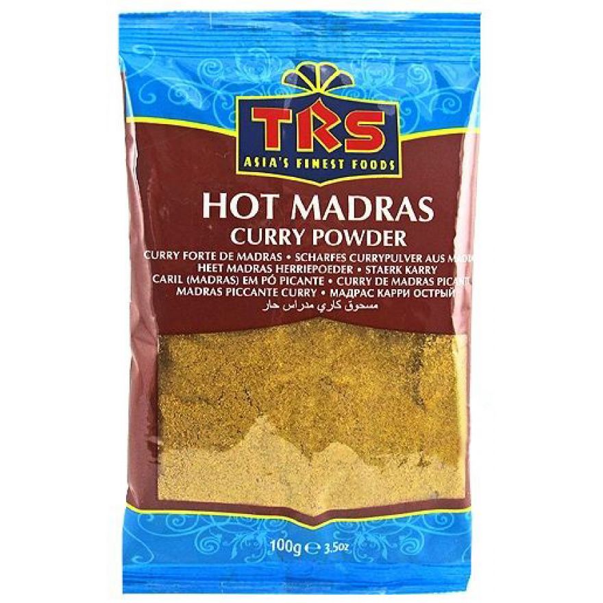 La poudre de curry fort de Madras Trs est un mélange aromatique d’épices (coriandre, curcuma, piment, moutarde, cumin, poivre, fenugrec, ail, sel, fenouil), importées spécialement de Madras et prêtes à l’emploi pour tous les plats authentiques de curry.